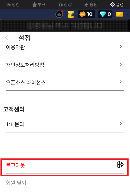 4. 밑으로 내려 로그아웃을 클릭합니다.