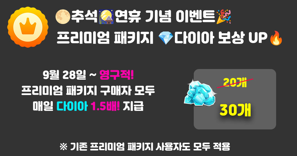 ▶ 이벤트 내용 : 프리미엄 패키지 사용 시 매일 수령 가능한 다이아 30개로 변경 (기존 20개)