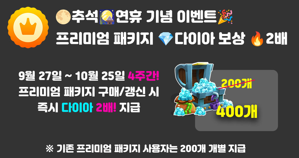 ▶ 이벤트 내용 : 프리미엄 패키지 구매/갱신 시 즉시 지급 다이아 400개 지급 (기존 200개)