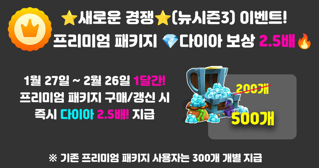 ▶ 이벤트 내용 : 프리미엄 패키지 구매/갱신 시 즉시 지급 다이아 500개 지급 (기존 200개)