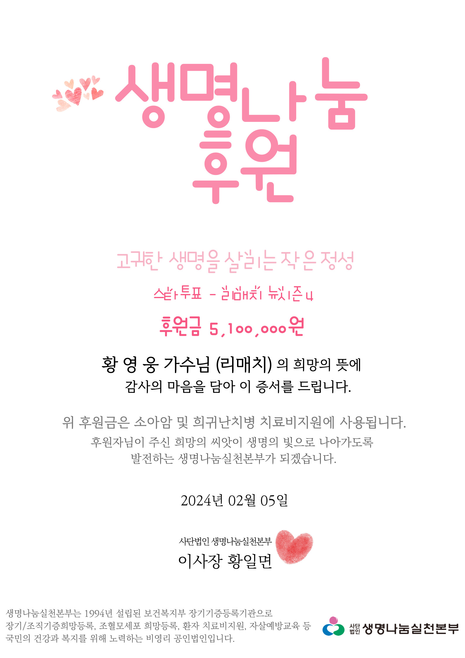 [황영웅, 임영웅, 이찬원, 정동원, 김희재, 영탁, 무룡, 안성훈, 박지현, 장민호, 김중연, 최우진, 최윤하, 최상] 가수님의 이름으로 사단법인 '생명나눔실천본부'를 통해 소아암 및 희귀난치병을 앓고 있는 어린이들을 위해 치료비로 사용되도록 전달되었습니다!