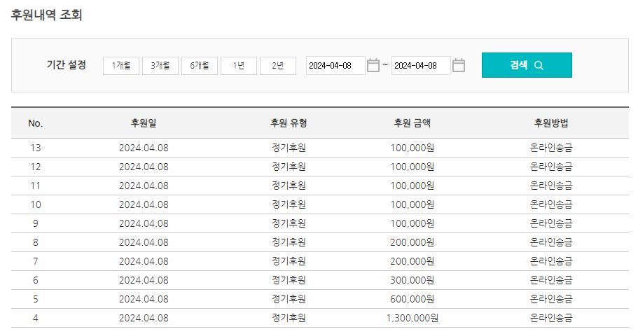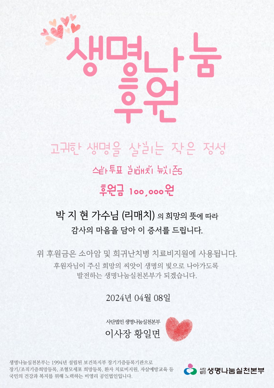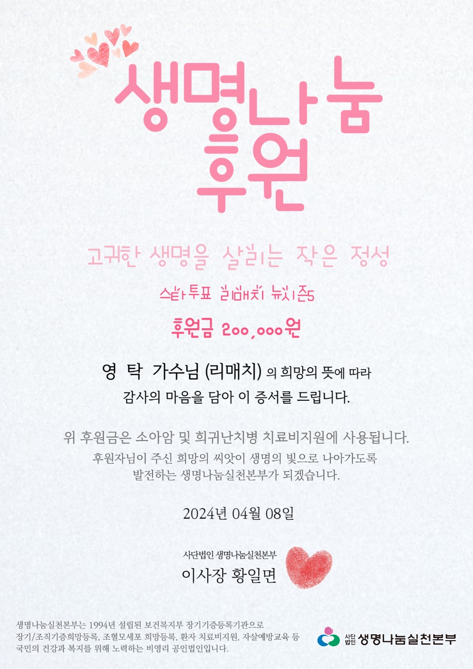 2024-4-8(월) 🏅뉴시즌5🏅에서 적립된 소중한 후원금 전달이 완료 되었습니다.