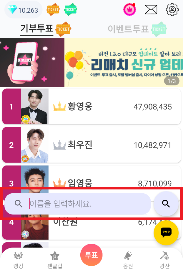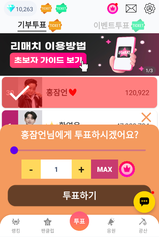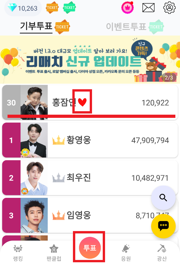 최애로 설정한 가수는 하트 표시와 함께 가장 처음 표시되어 순위와 득표수를 확인할 수 있고 쉽게 투표를 할 수 있습니다.