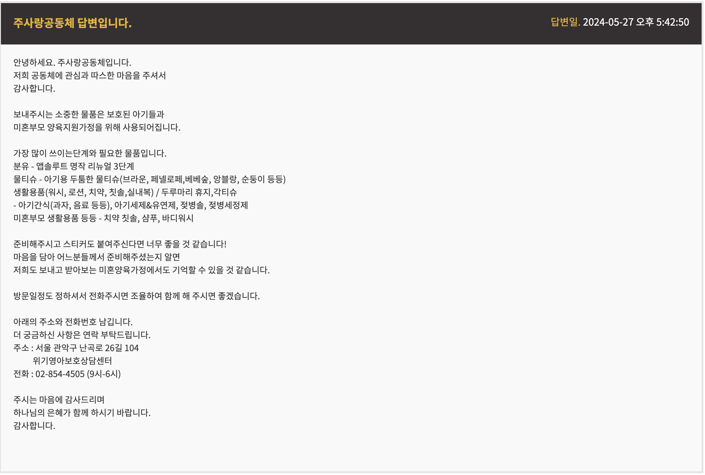'주사랑공동체 (베이비박스)'에 직접 물건을 전달했습니다!