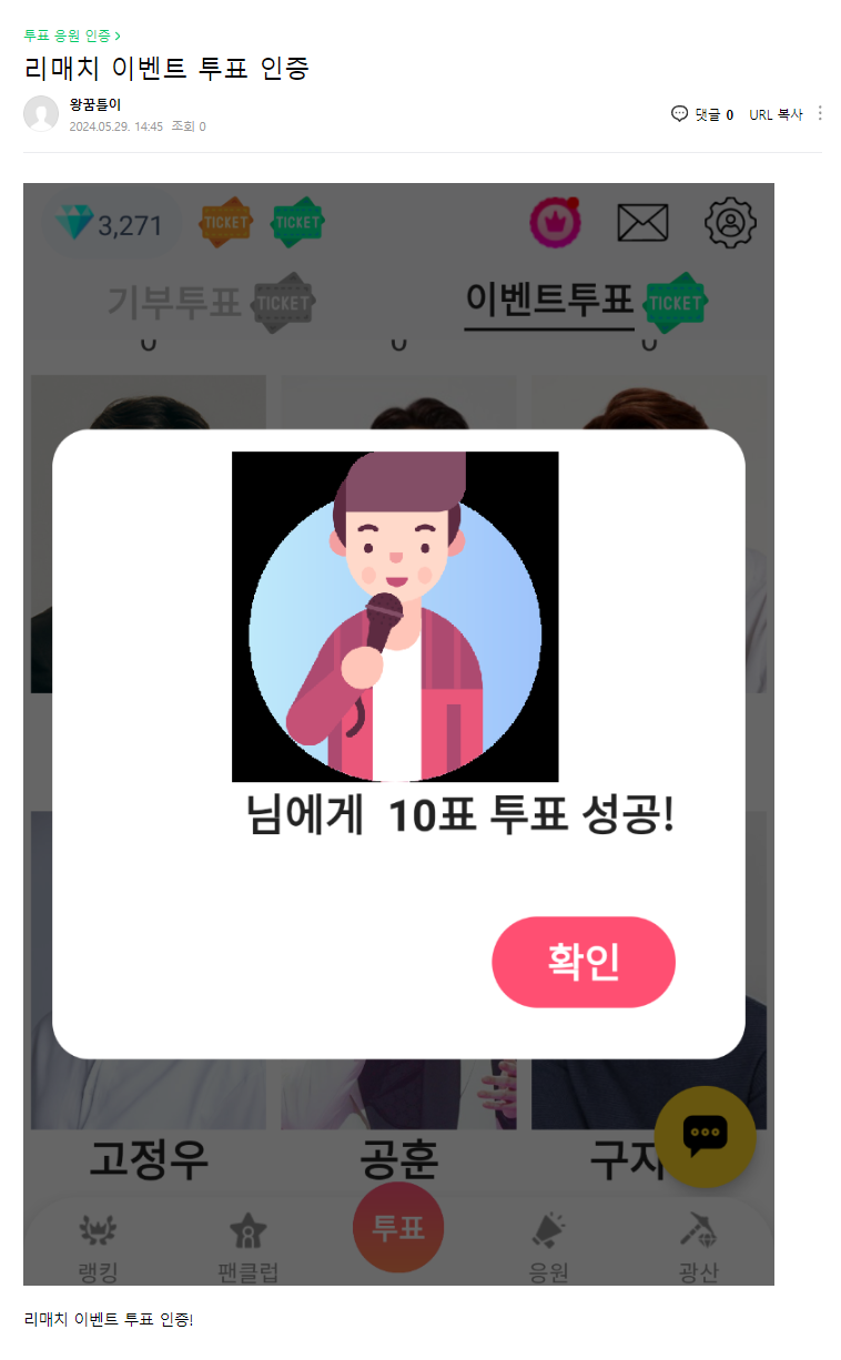 1️⃣ 가입하신 팬 카페에 투표 인증 글을 작성하고 캡쳐해주세요!