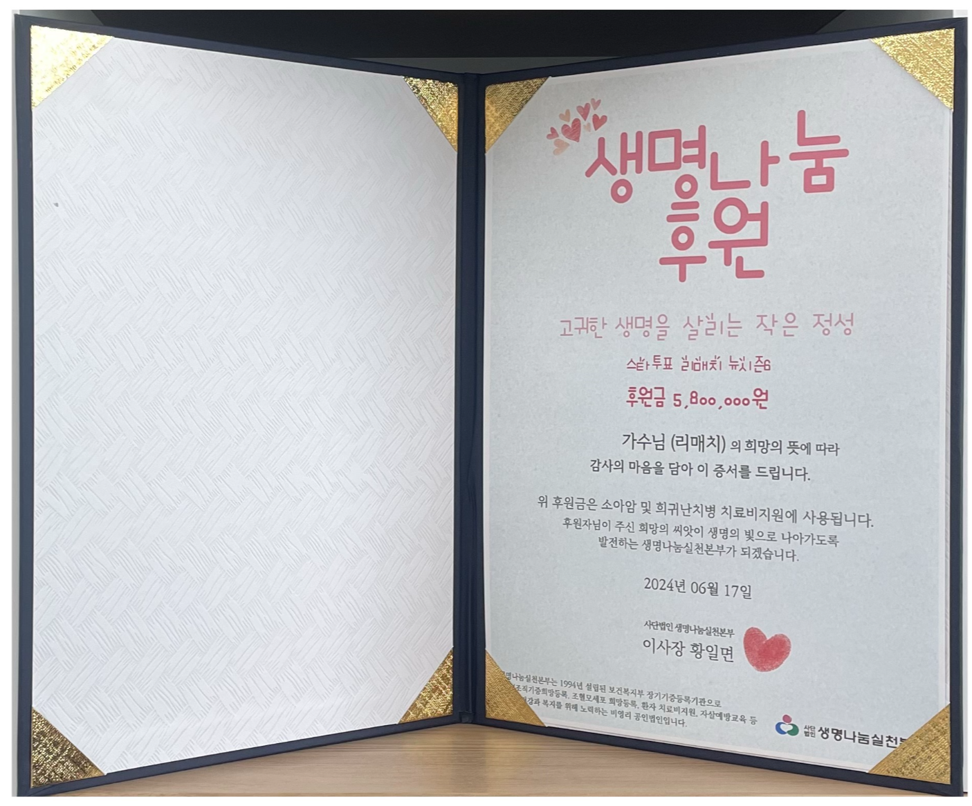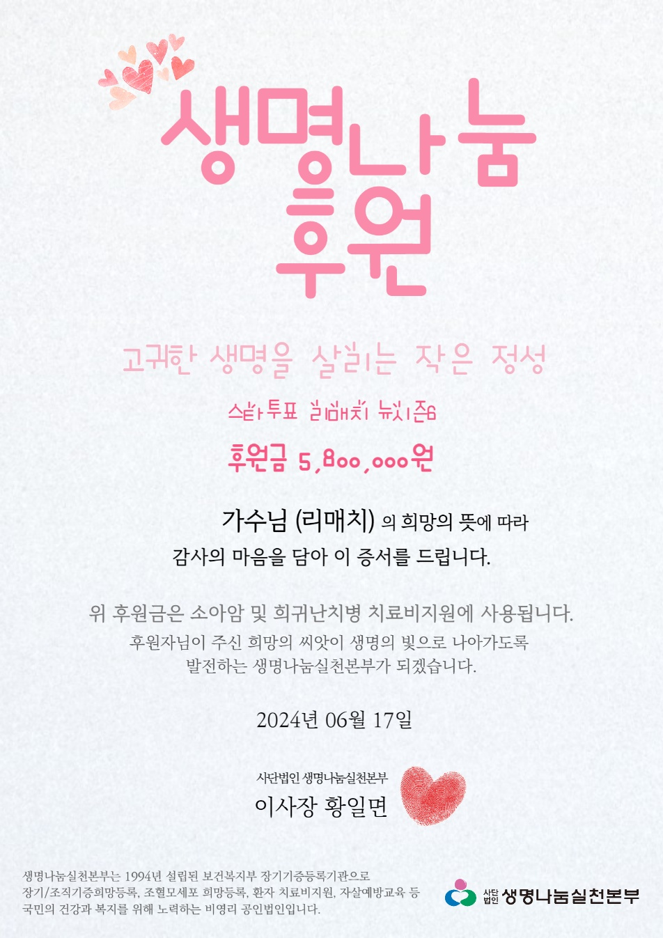 기부처 : (사)생명나눔실천본부 (https://www.lisa.or.kr)