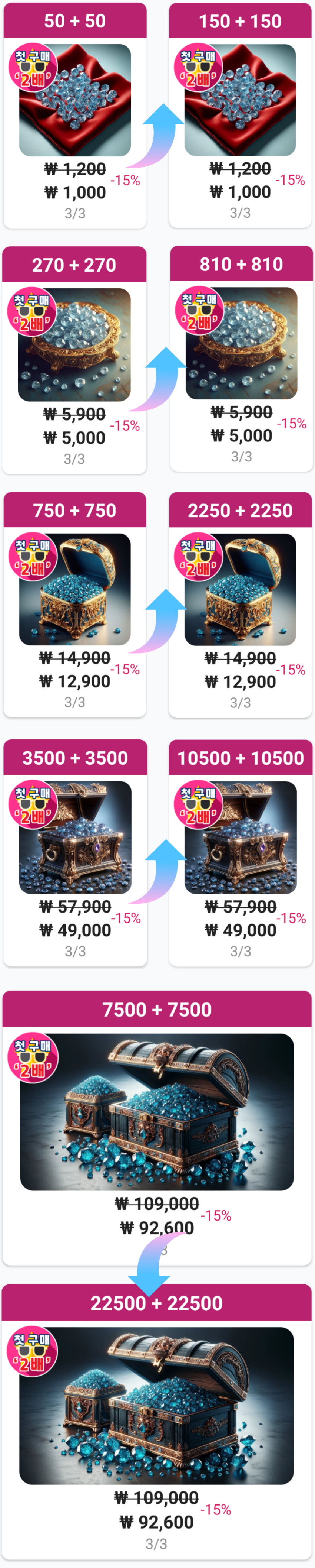 회원님들에게 더욱 많은 다이아를 제공하기 위해 패키지 가격은 그대로! 제공 다이아는 더욱 많이! 드립니다.