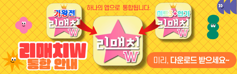 '가왕전 리매치W', '미트3+현가 리매치W' 사용하시던 분은 '리매치W' 다운받아 현재 사용하시던 계정 그대로 사용 하시면 되고 '리매치W' 사용자는 그대로 사용하시면 됩니다.