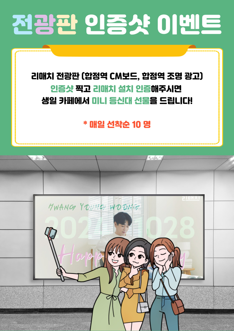 황영웅 가수님의 멋진 모습을 담은 합정역 2개의 전광판을 찾아 인증샷을 찍고, 리매치 앱을 설치한 후 생일 카페를 방문하시면 특별한 미니 등신대를 선물로 드립니다!