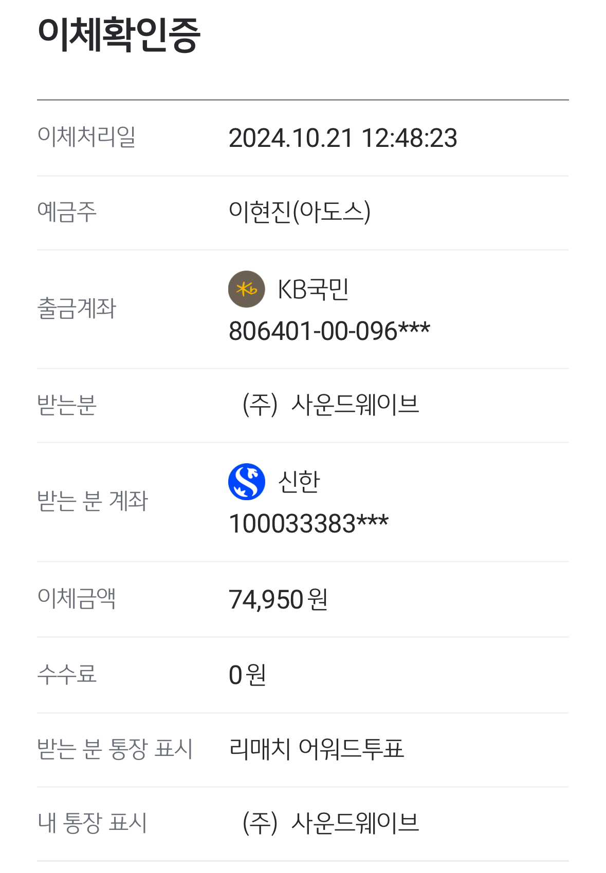 총 74,950원 팬클럽을 통해 앨범 구매 계좌로 전달 완료!