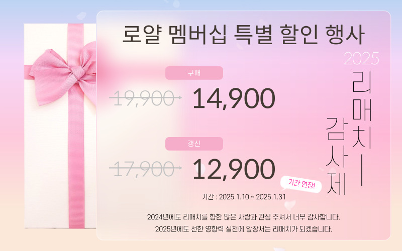 여러분의 성원에 보답하고자 특별한 로얄 멤버십 가입 및 갱신 할인 이벤트를 준비했습니다.