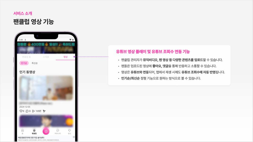 유튜브 스밍을 앱 내에서도 가능하게 되었습니다. (가수 관련 영상 업로드 승인은 팬클럽 리더 한정 가능)