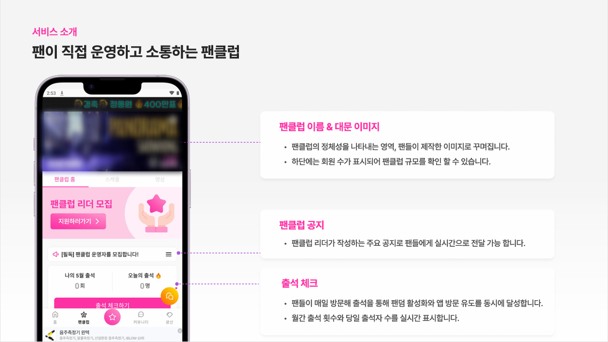 - 앱 내에서 중요한 공지 및 알림을 팬들에게 전체 발송 할 수 있는 기능 (팬클럽 리더 한정 가능)
