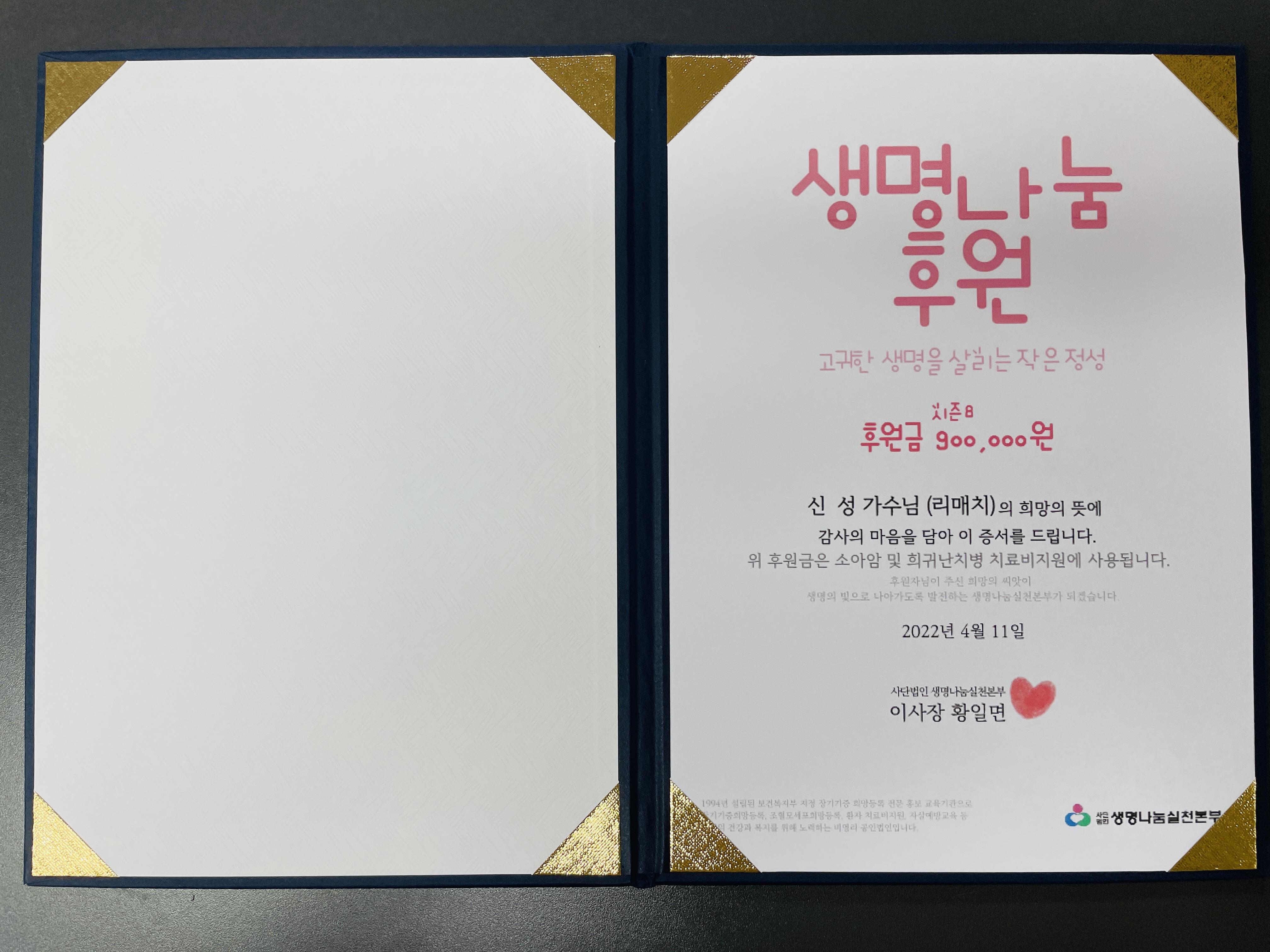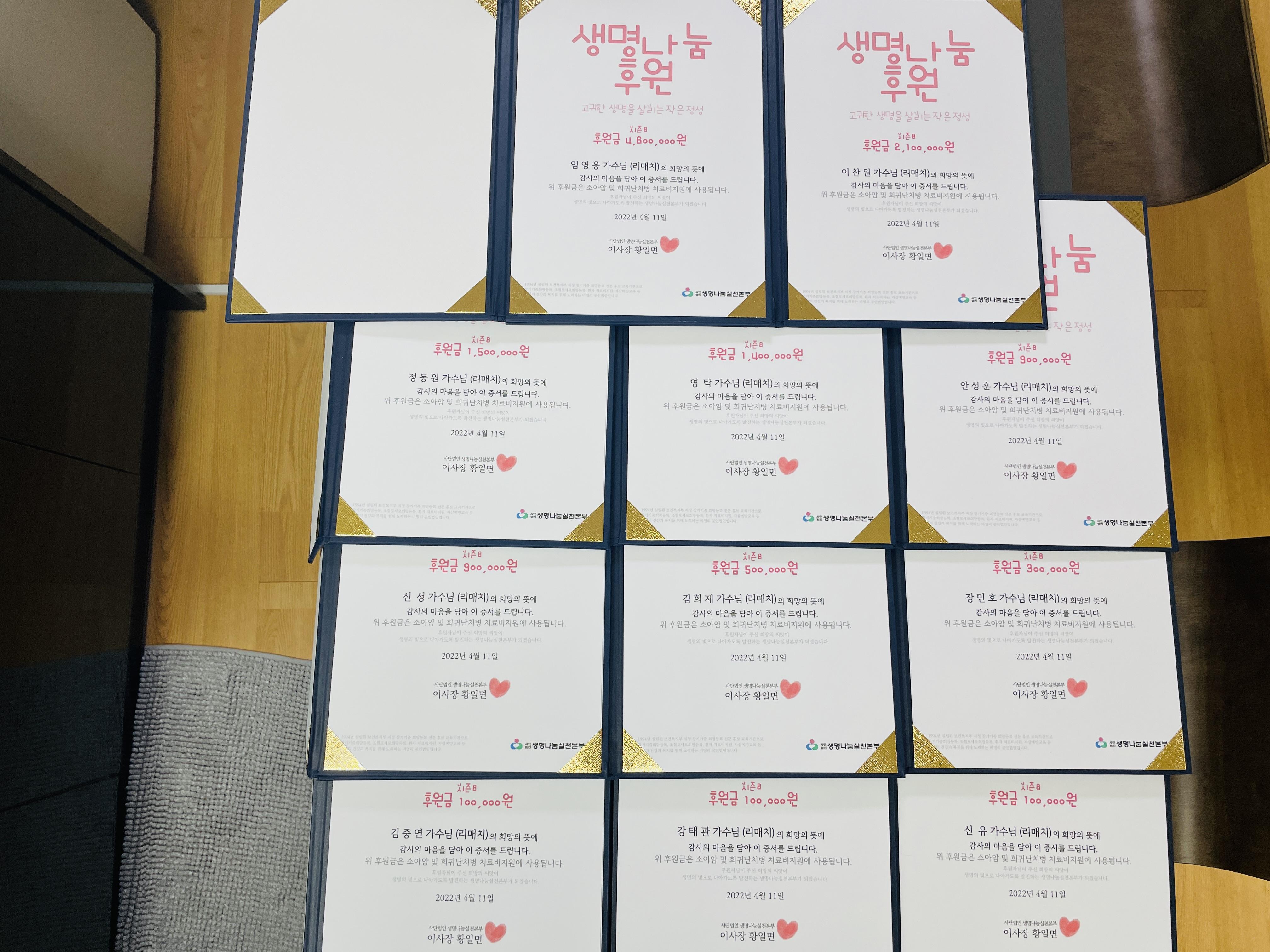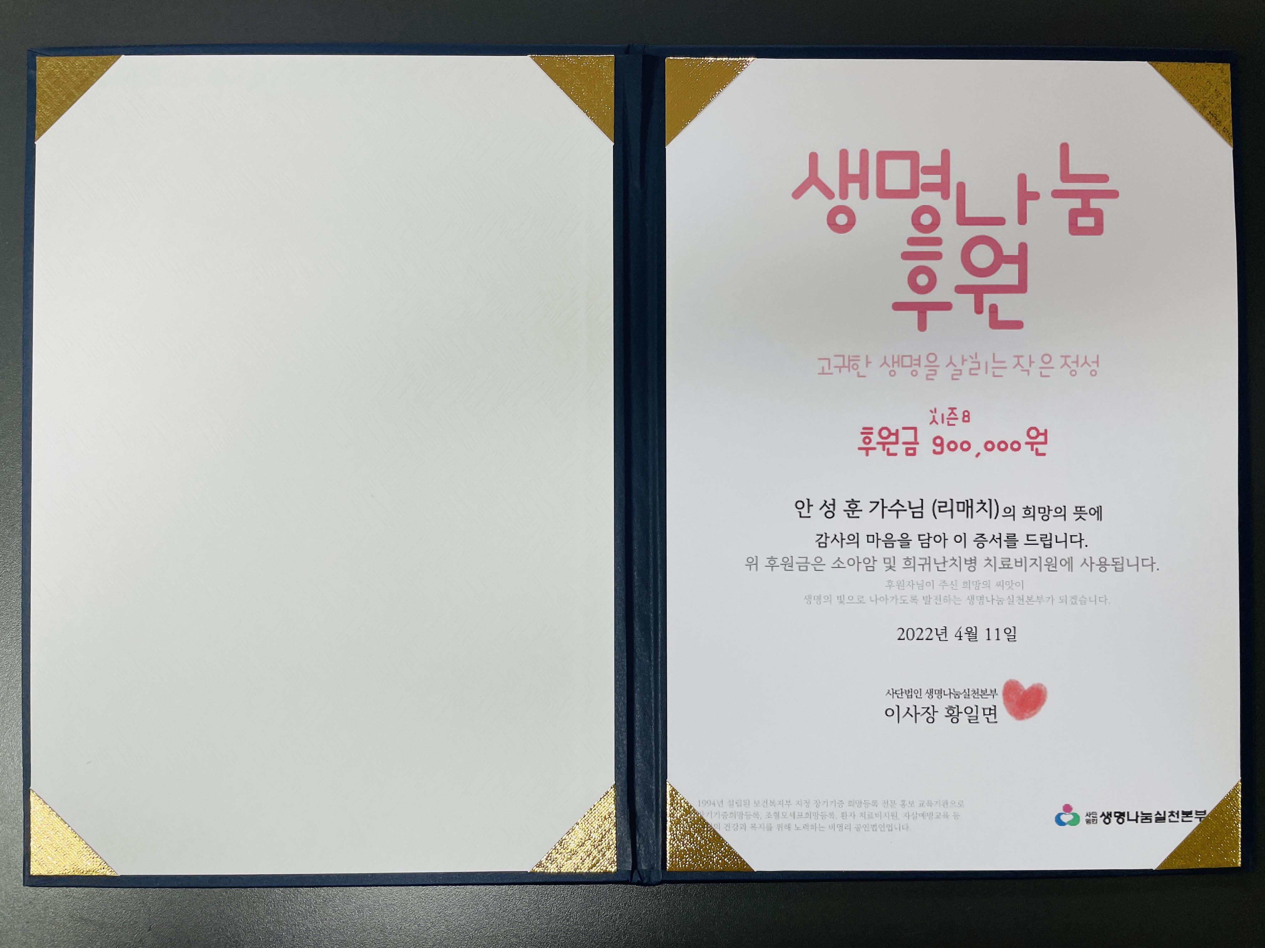 이번에 기부한 🏅시즌8🏅의 실물 후원증서가 도착하여 공유해 드립니다!