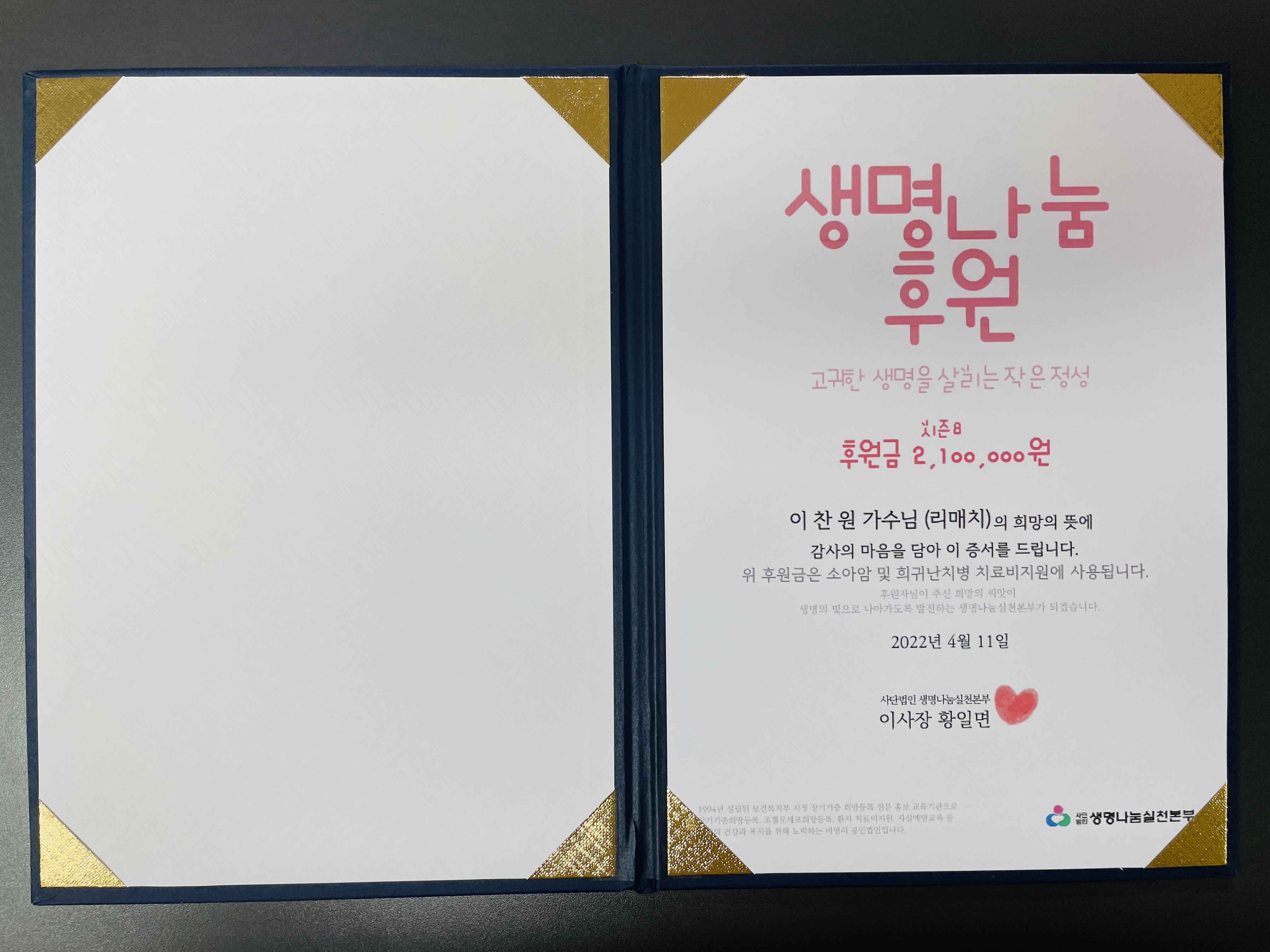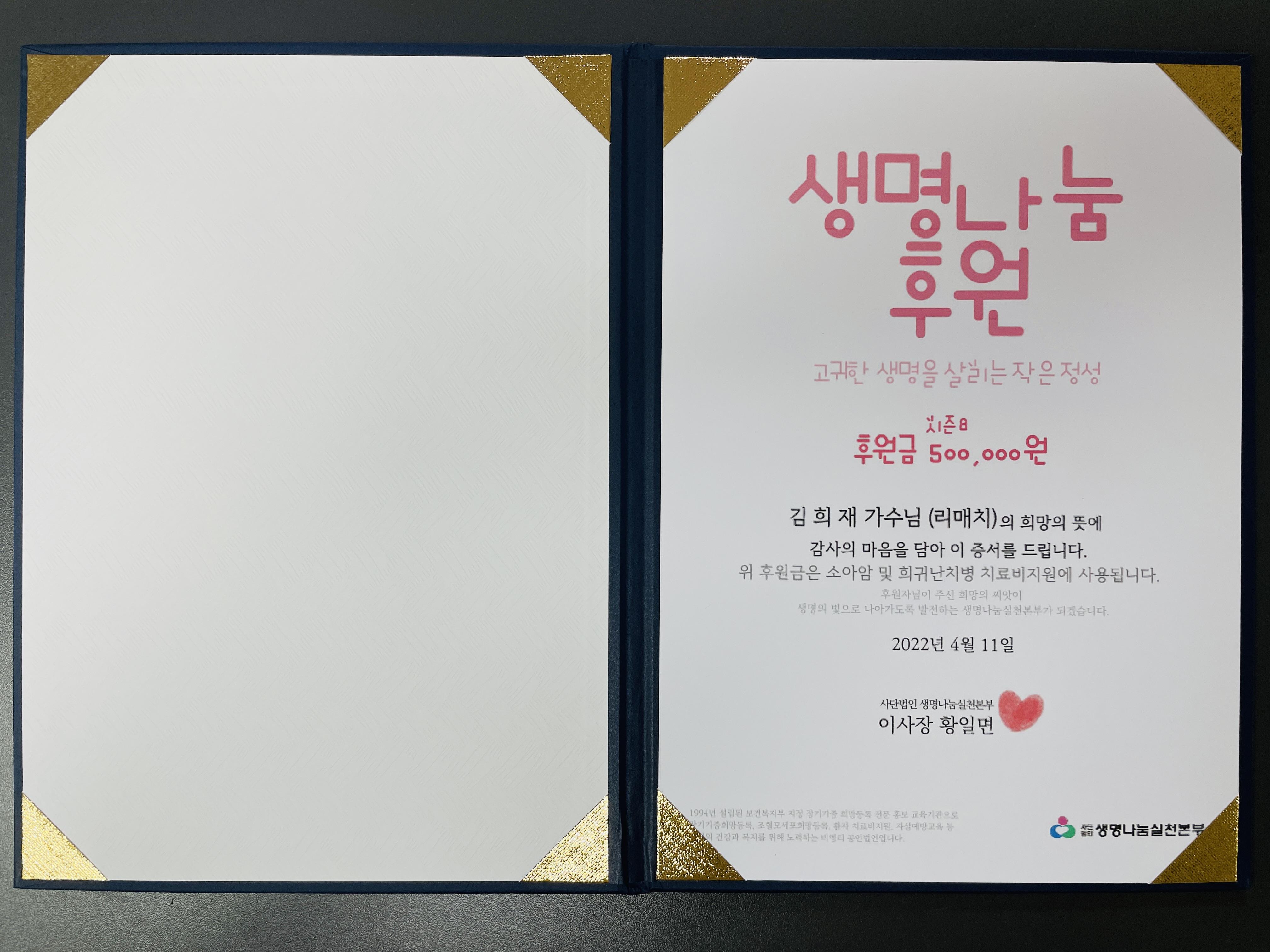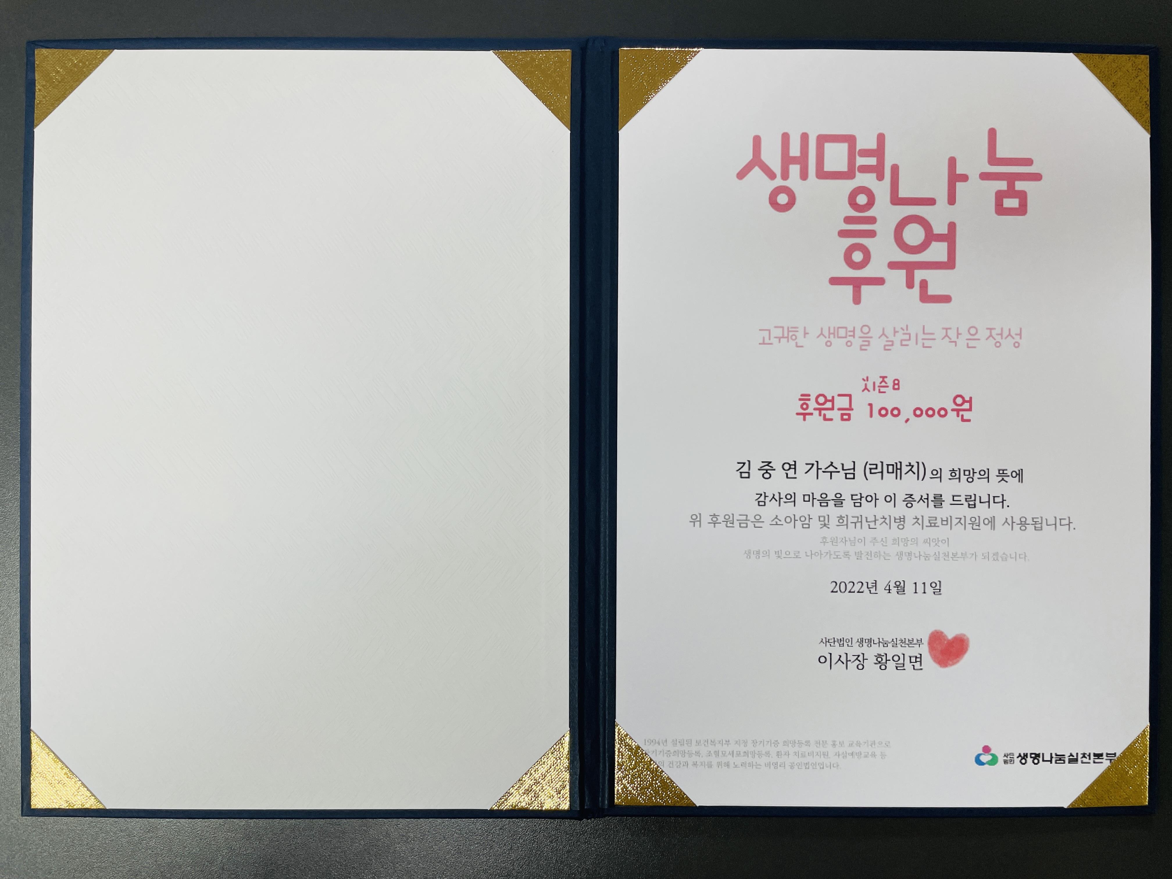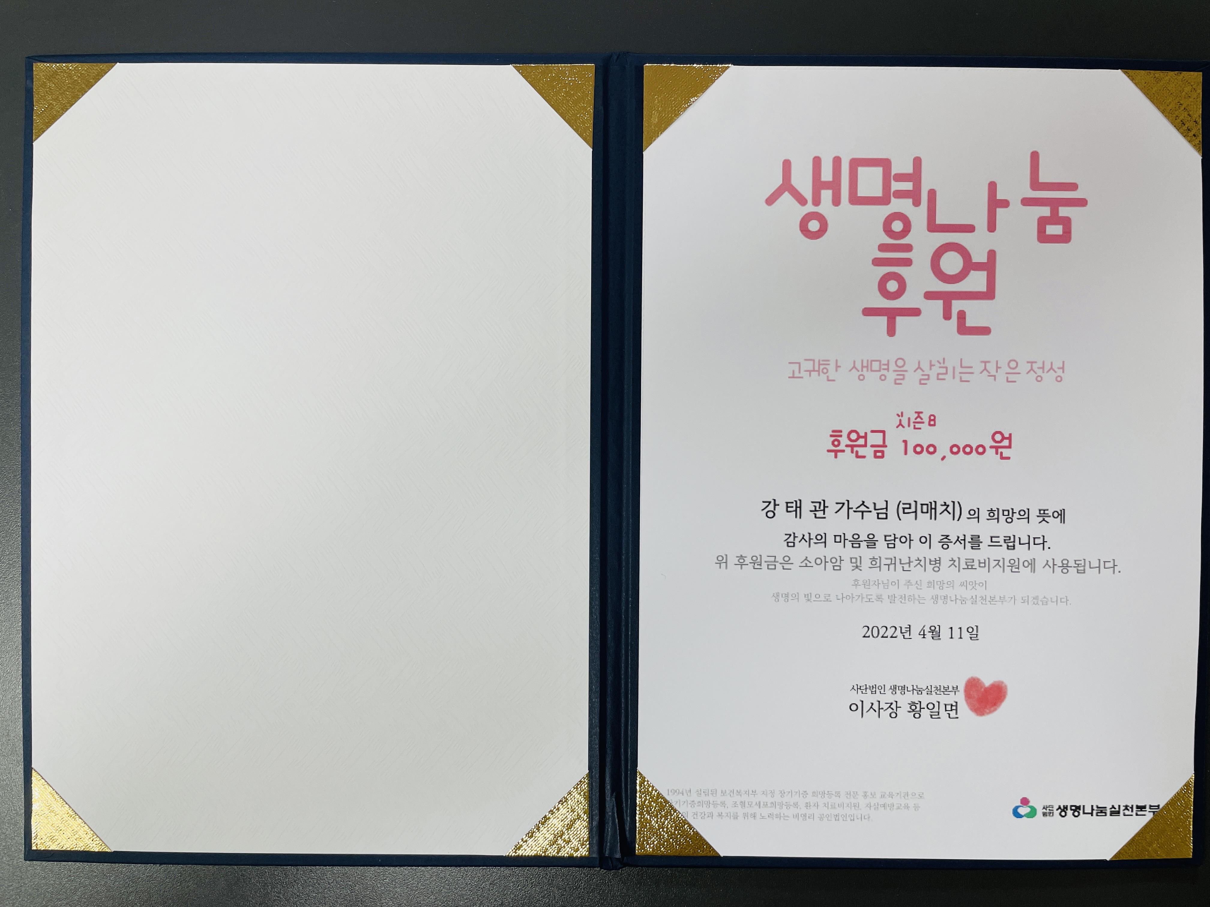 가수님 이름으로 전달한 소중한 기부금은 소중한 생명을 살리는데 잘 사용되도록 '생명나눔실천본부'에 당부하였습니다.