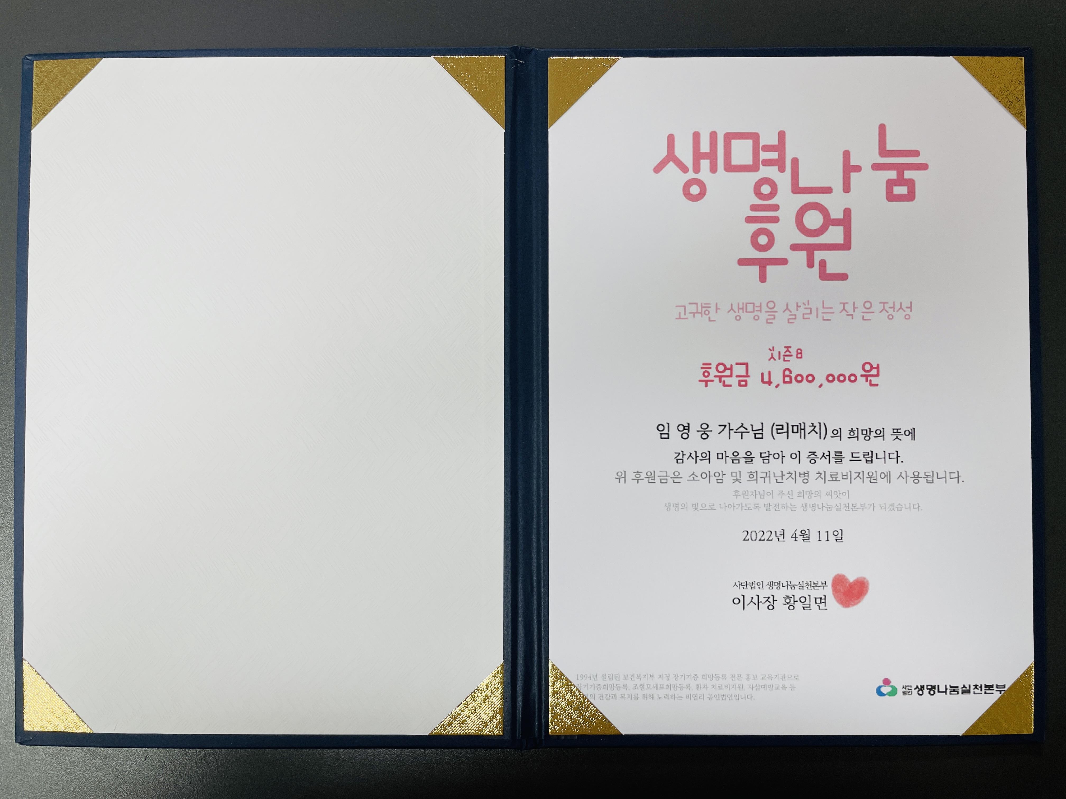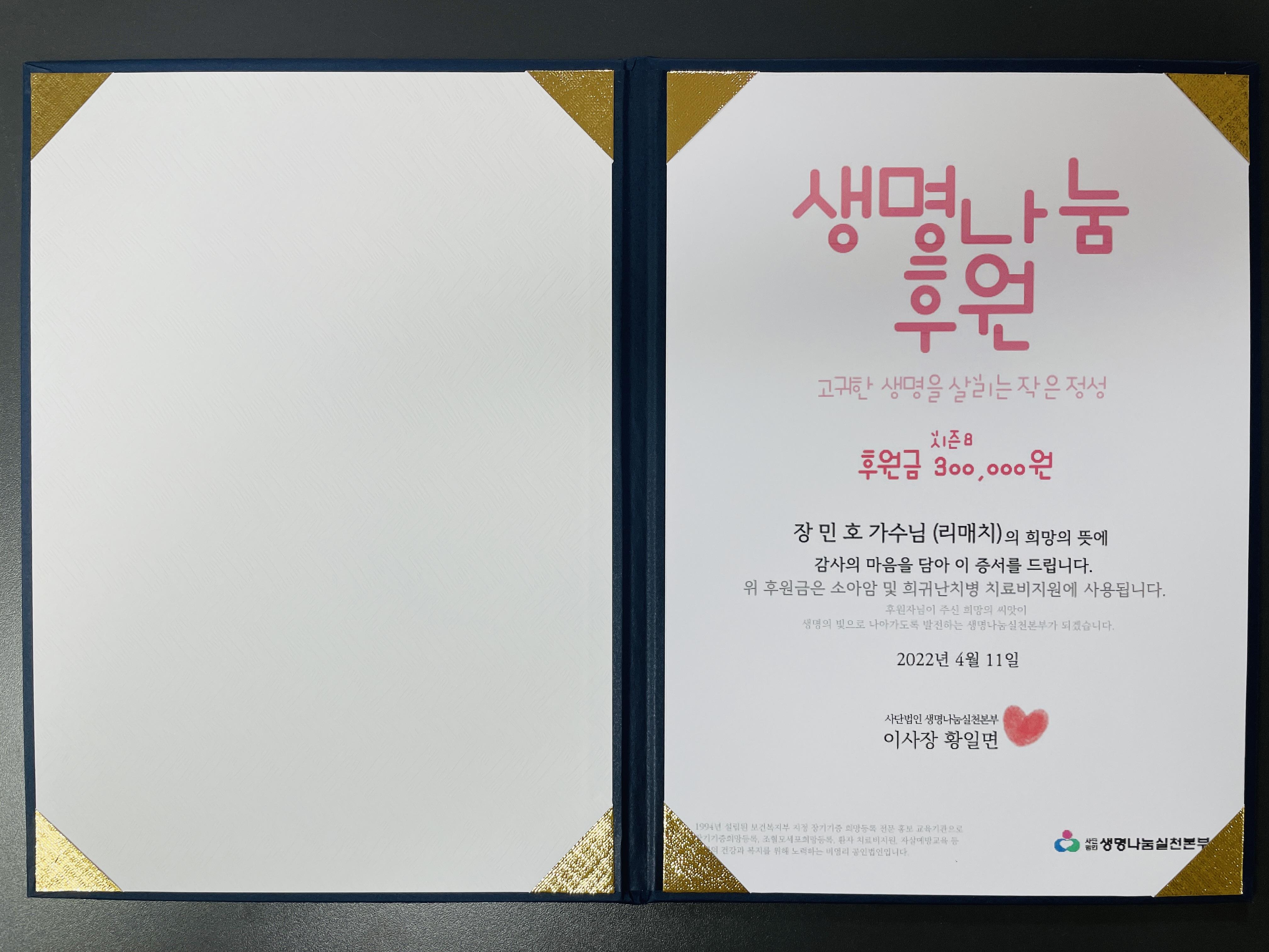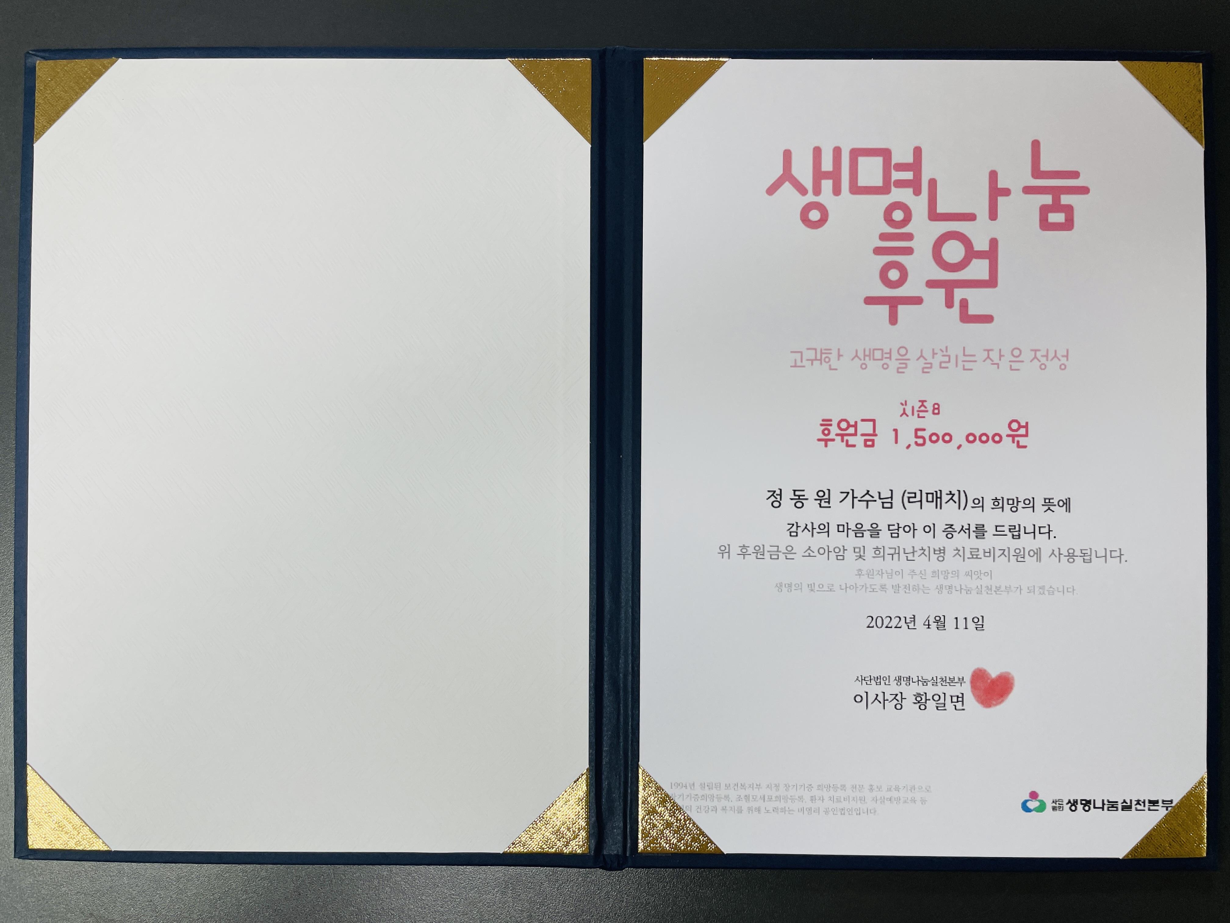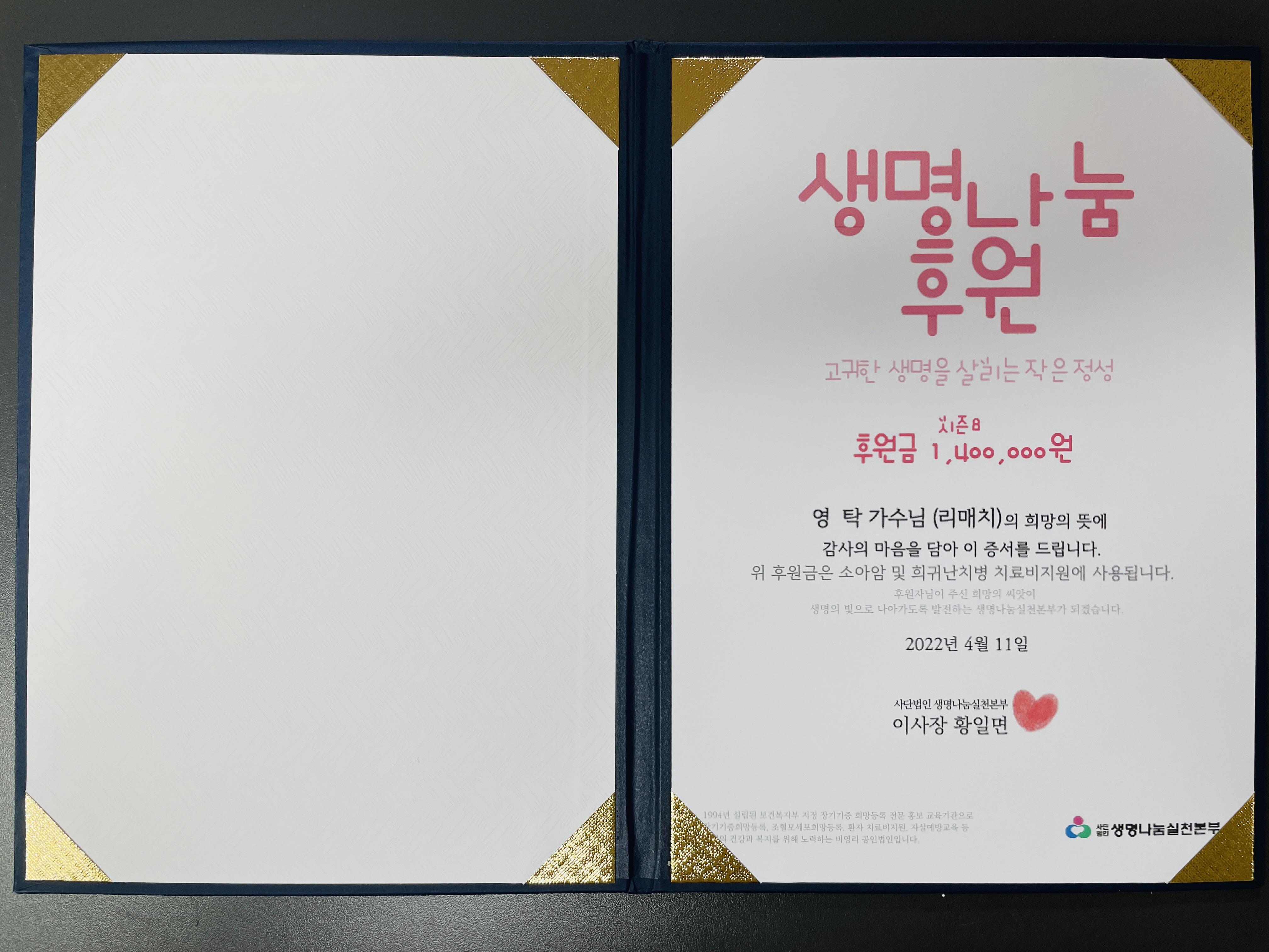 가수님 이름으로 전달한 소중한 기부금은 소중한 생명을 살리는데 잘 사용되도록 '생명나눔실천본부'에 당부하였습니다.
