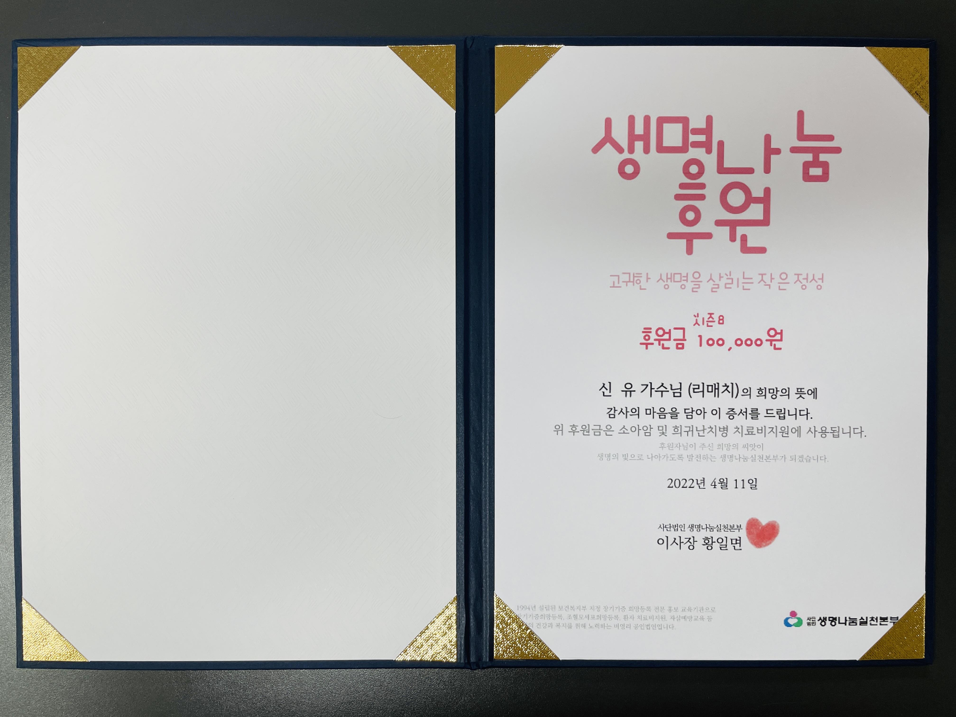 가수님의 실물 후원증서는 아래와 같이 도착했습니다.