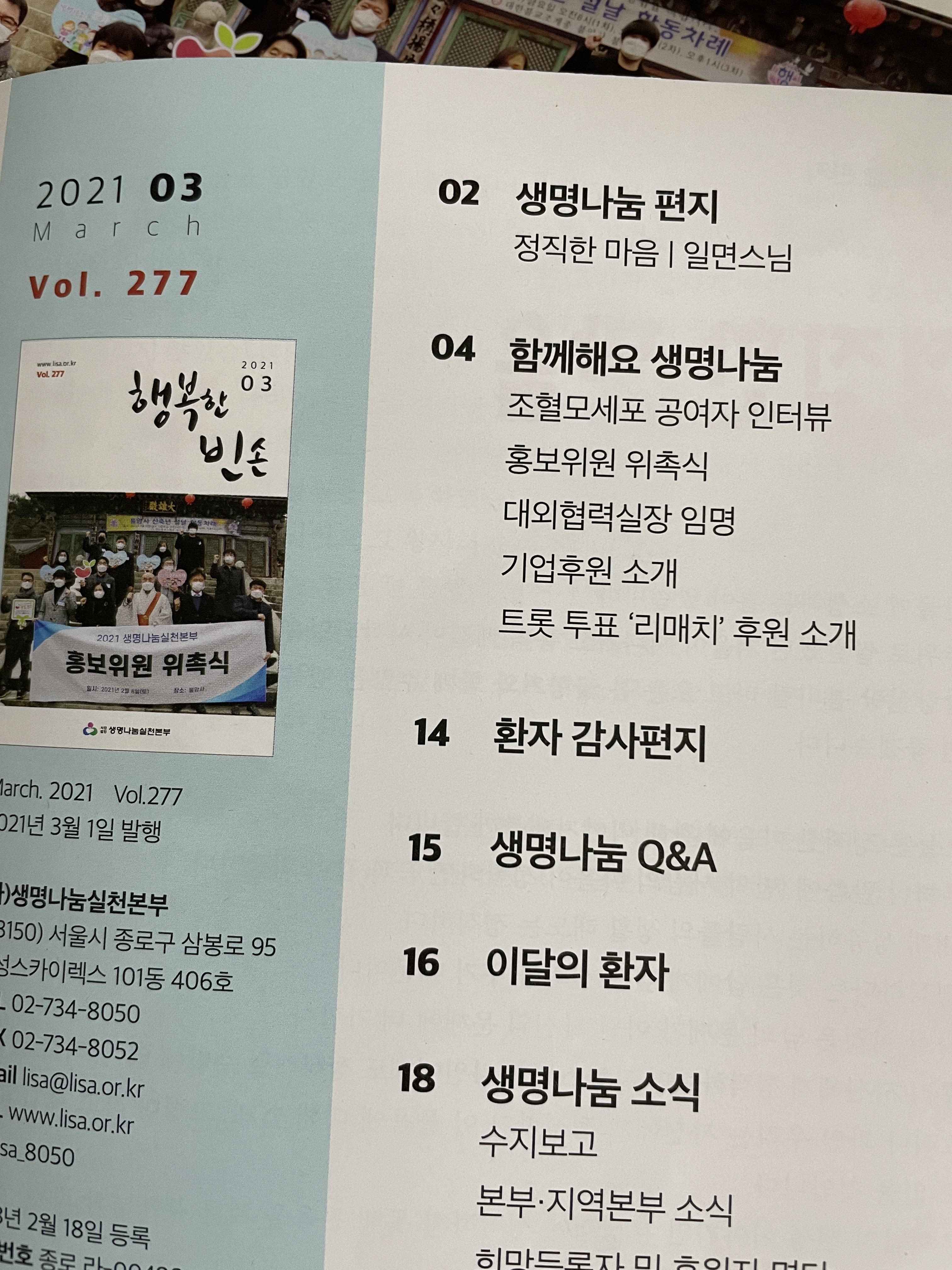생명나눔실천본부 소식지의 표지는 이런 모습입니다.