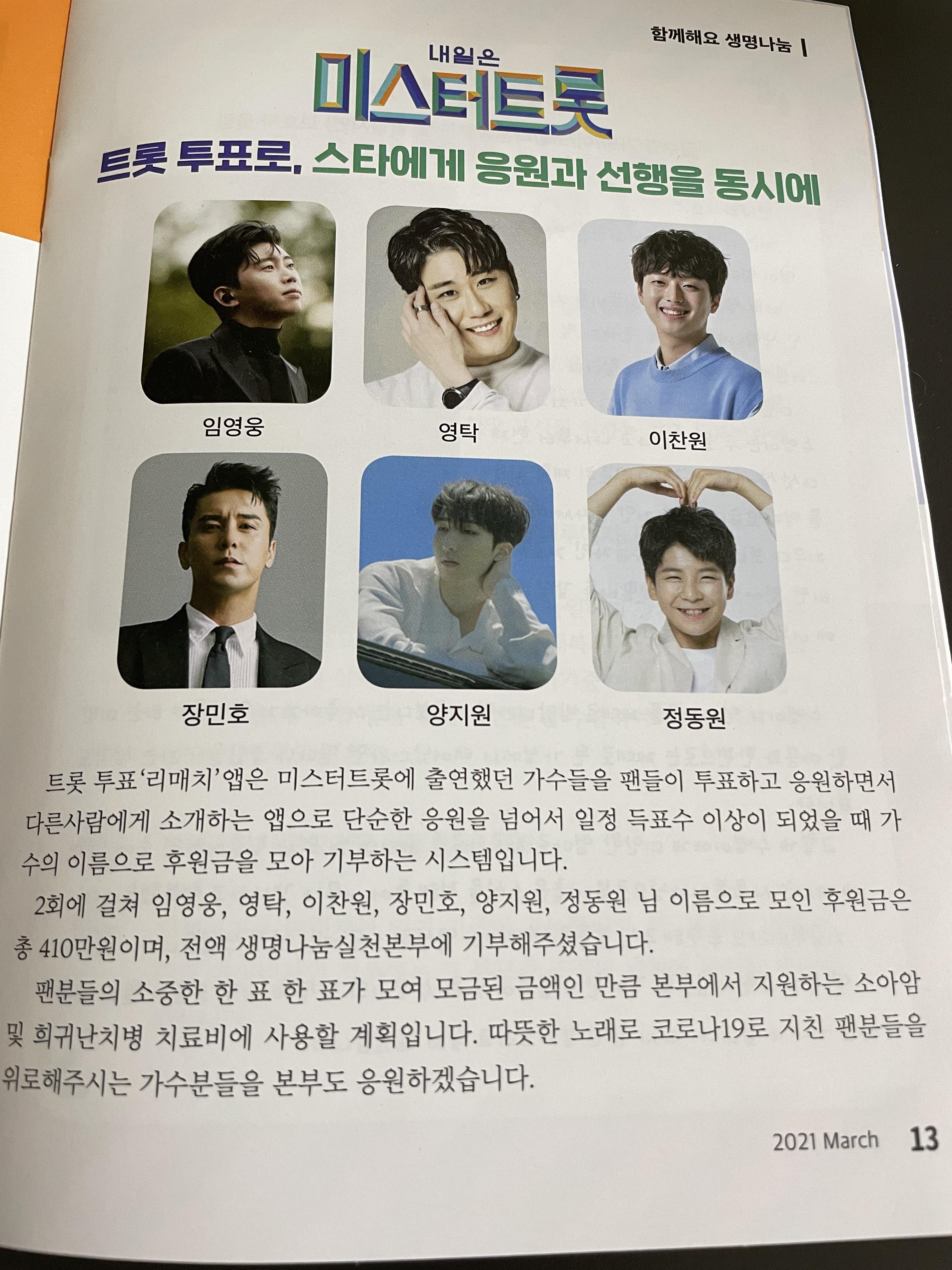 짜잔~! 생명나눔실천본부 자체 발행하는 소식지 일면에 우리 가수님들의 얼굴과 기부 소식이 이쁘게 기재 되었습니다.