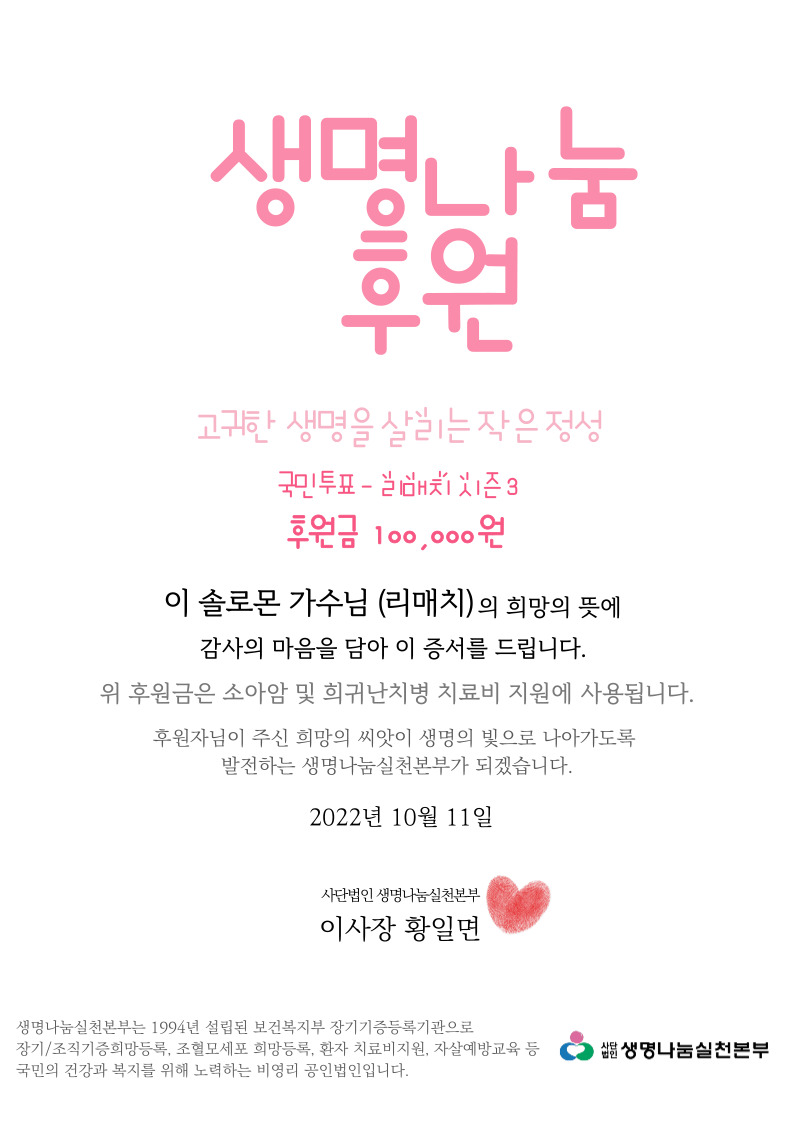 국민 투표 - 리매치 🏅시즌3🏅 실물 후원증서