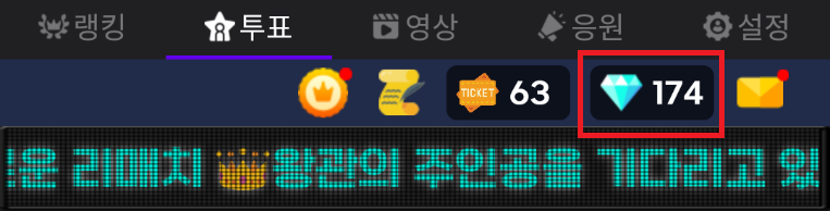다이아는 화면 상단에 표시되어 언제든 확인 가능하며 투표권 뽑기는 물론 전광판 광고 등 앞으로 나올 다양한 컨텐츠에 이용될 예정입니다.